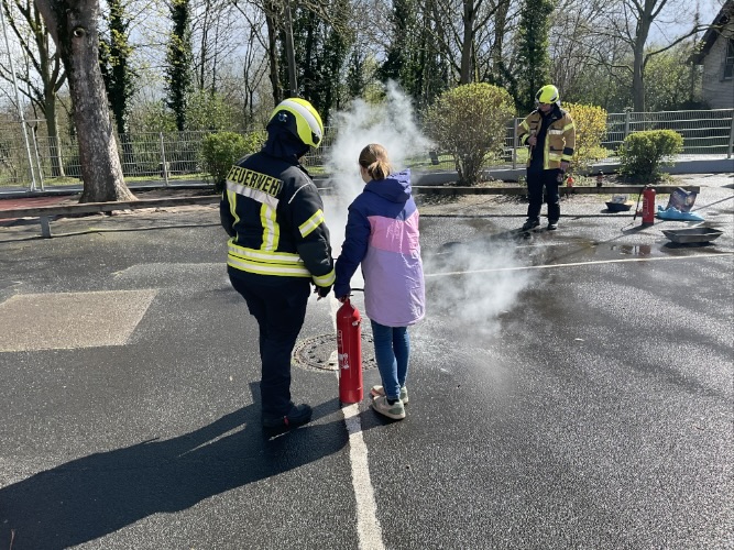 Am Anfang stand die Wiederholung bereits gelernter Inhalte rund um das richtige Verhalten im Brandfall. Die Kinder konnten ihr Wissen aktiv einbringen und vertiefen.