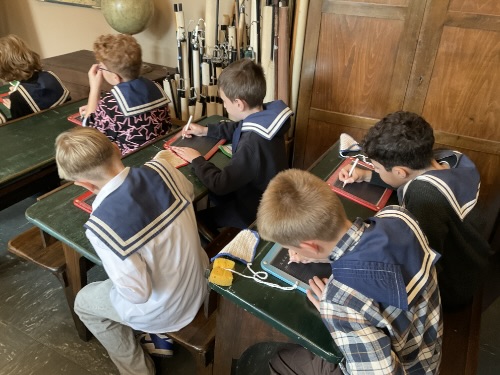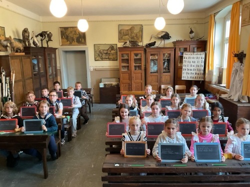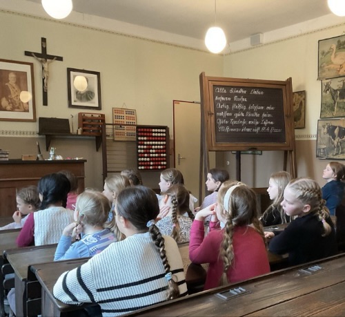 Im Museum durften wir in einem alten Klassenzimmer sitzen. Dort erfuhren wir, wie der Unterricht vor über 100 Jahren war. Das „Fräulein Lehrerin“ zeigte uns alte Schulranzen, Hefte und Tafeln. Wir staunten, wie streng der Unterricht damals war und wie anders Schule früher aussah.